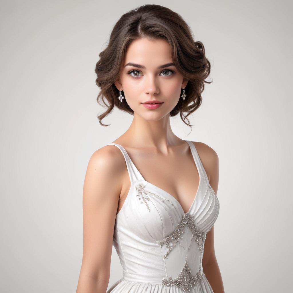 A young woman stands confidently in a modern dress, showcasing her graceful posture and exquisite earrings against a soft background.