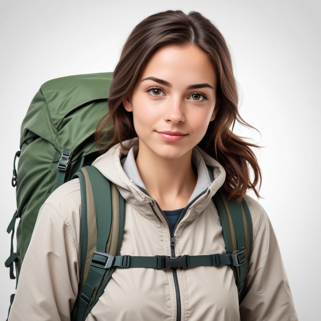 A young woman with a backpack prepares for an outdoor hike, wearing a light jacket and smiling confidently, ready to explore.