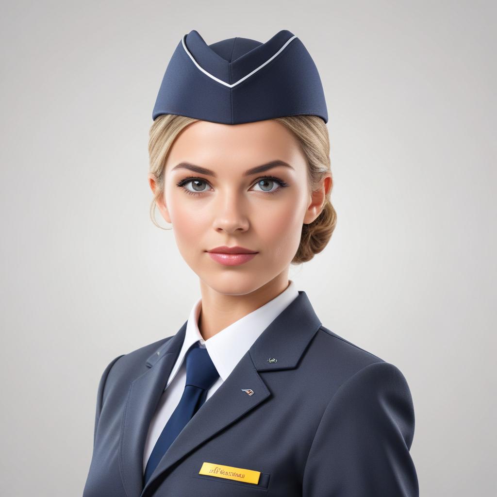 A flight attendant stands confidently, wearing a navy uniform with a hat and a name tag. She smiles warmly, showcasing professionalism.