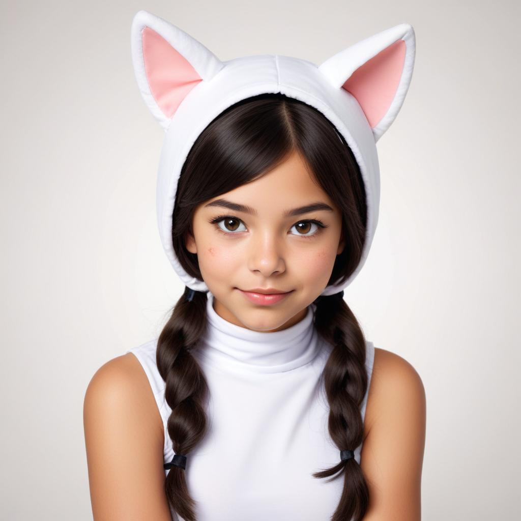 A girl with braided hair wears a white hat with cat ears. She looks directly at the camera with a calm expression.