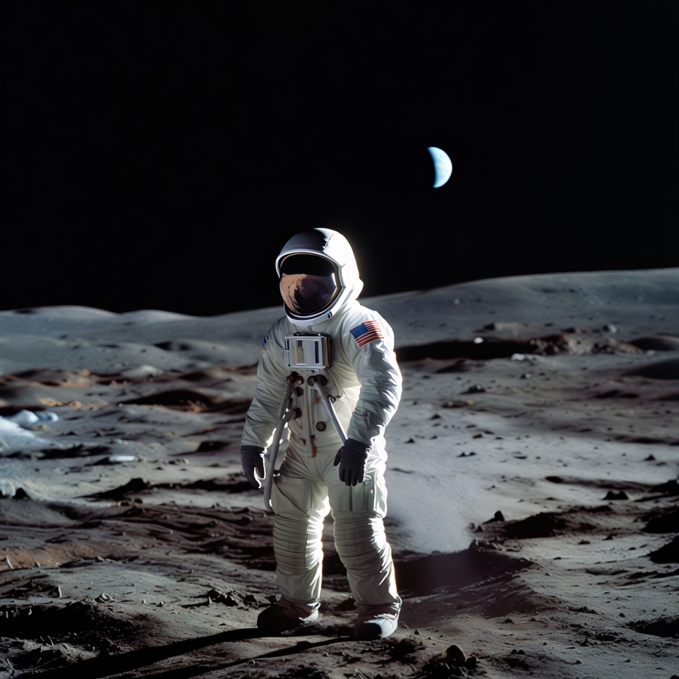 Apollo mission, Earth view, Moon, NASA, astronaut, astronaut suit, barren terrain, celestial body, cosmic, extraterrestrial, human achievement, low gravity, lunar landscape, lunar surface, moonwalk, outer space, science, scientific endeavor, space exploration, space travel