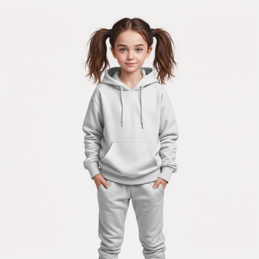 casual, character, child, comfortable, confident, fashion, girl, gray, hoodie, indoor, kid, outfit, playful, ponytails, relaxed, standing, style, sweatpants, young, youth