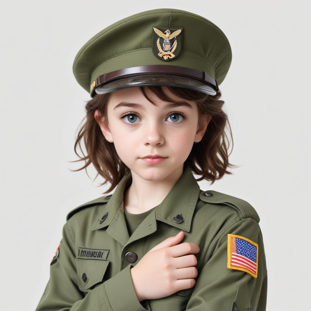 A young child wears a military uniform and cap, standing still with a serious expression in a simple studio background, showcasing pride.