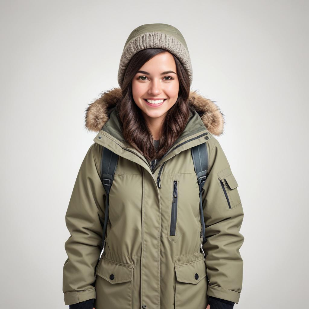 A cheerful woman stands against a neutral background, wearing a cozy winter coat and a knitted hat, ready for cold weather.