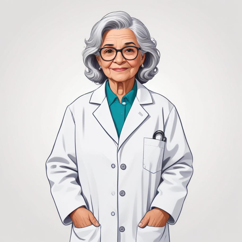 A senior woman wearing glasses stands confidently in a white lab coat. She has gray hair and a warm smile, ready to assist patients.