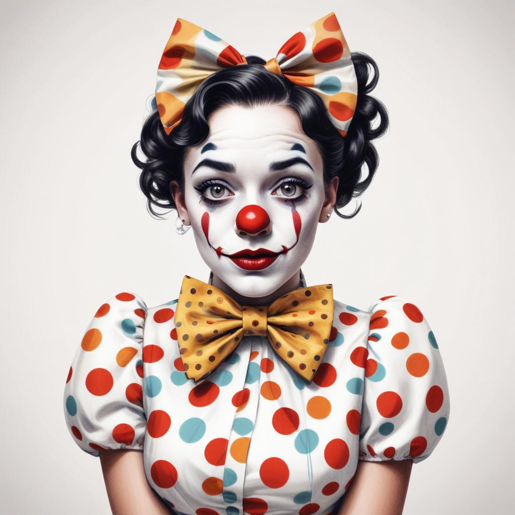 artistry, cheerful, circus, clown, colorful, community, costume, entertainment, event, expression, festival, fun, makeup, performer, playful, polka dot, portrait, smile, whimsical, woman