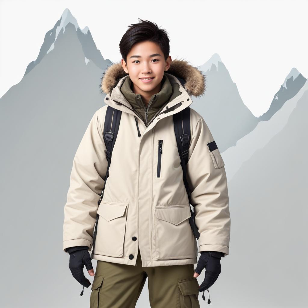 adventure, adventure gear, backpack, boy, casual wear, clothing, cold weather, fashion, fur hood, gloves, hiking, mountains, nature, outdoor, scenery, warm attire, winter clothing, winter jacket, youth, youth style