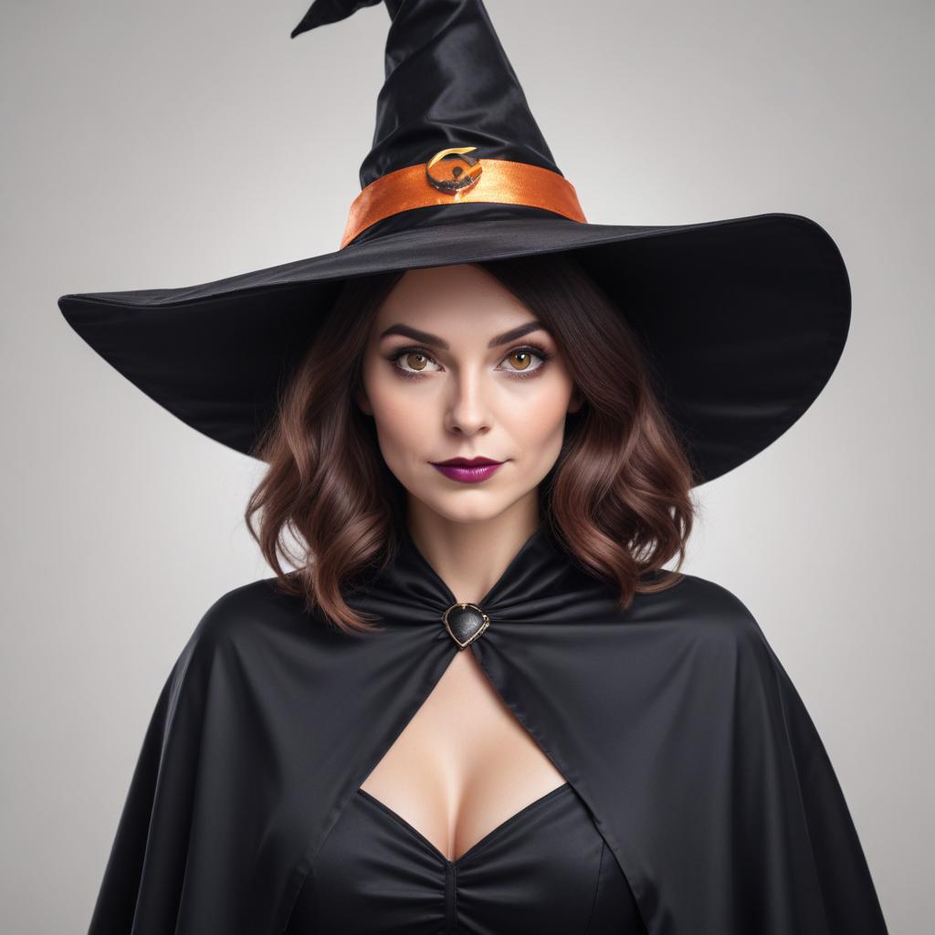 A woman dressed as a witch with a black hat and cape stands against a neutral background. She prepares for Halloween festivities.