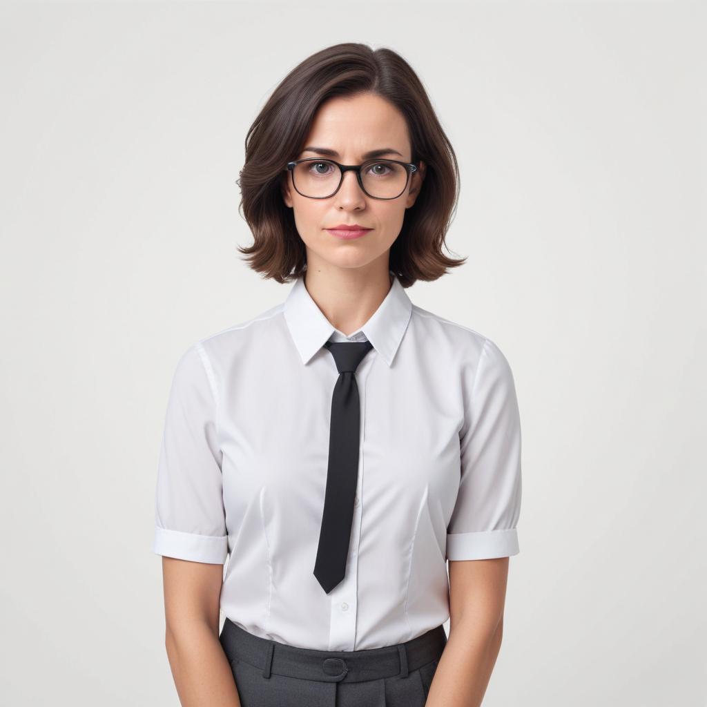 A confident woman stands in a formal outfit with a black tie and glasses. Her straightforward expression suggests professionalism and focus.