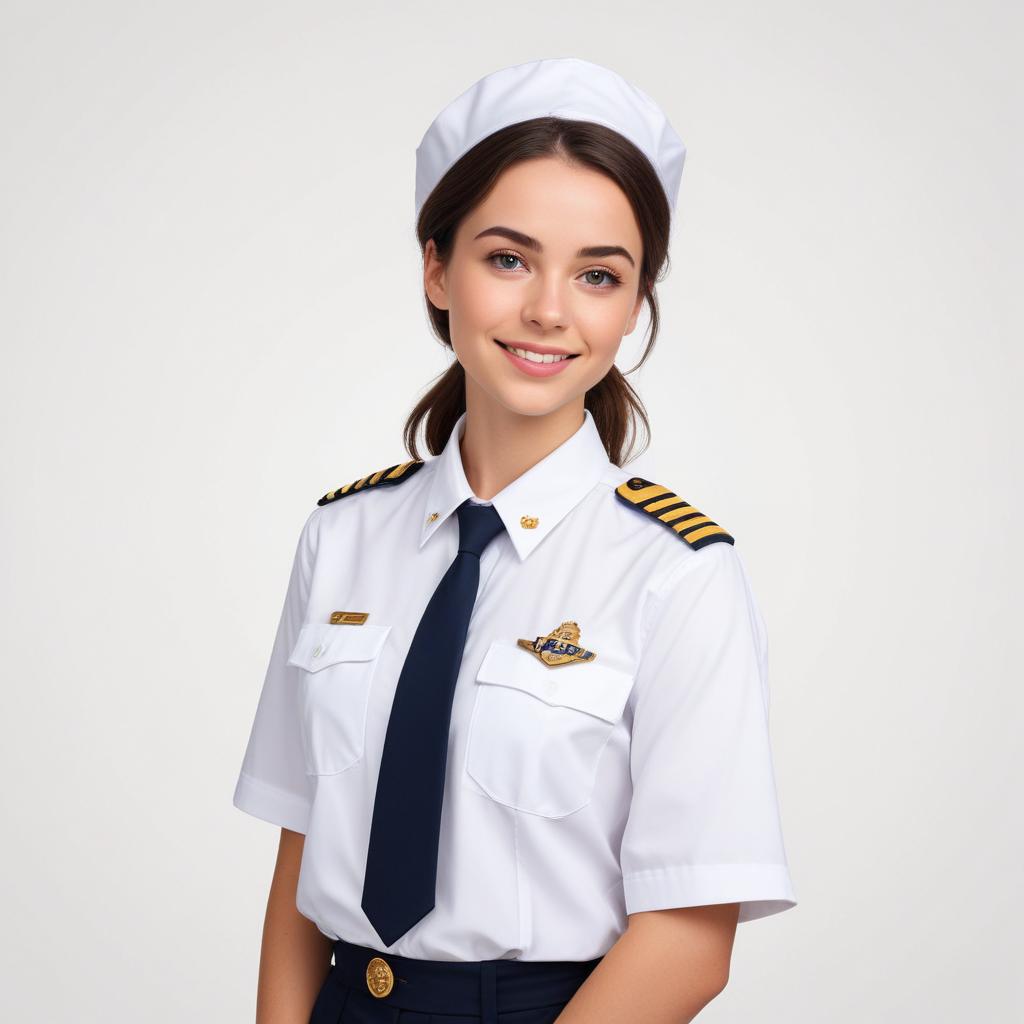 A young woman in a pilot uniform stands confidently, wearing a white shirt and navy tie, with a cap. She looks friendly and professional.