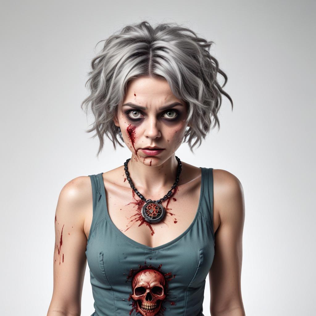 A woman with striking gray hair portrays a horror character, featuring dramatic makeup, a skull necklace, and fake blood.