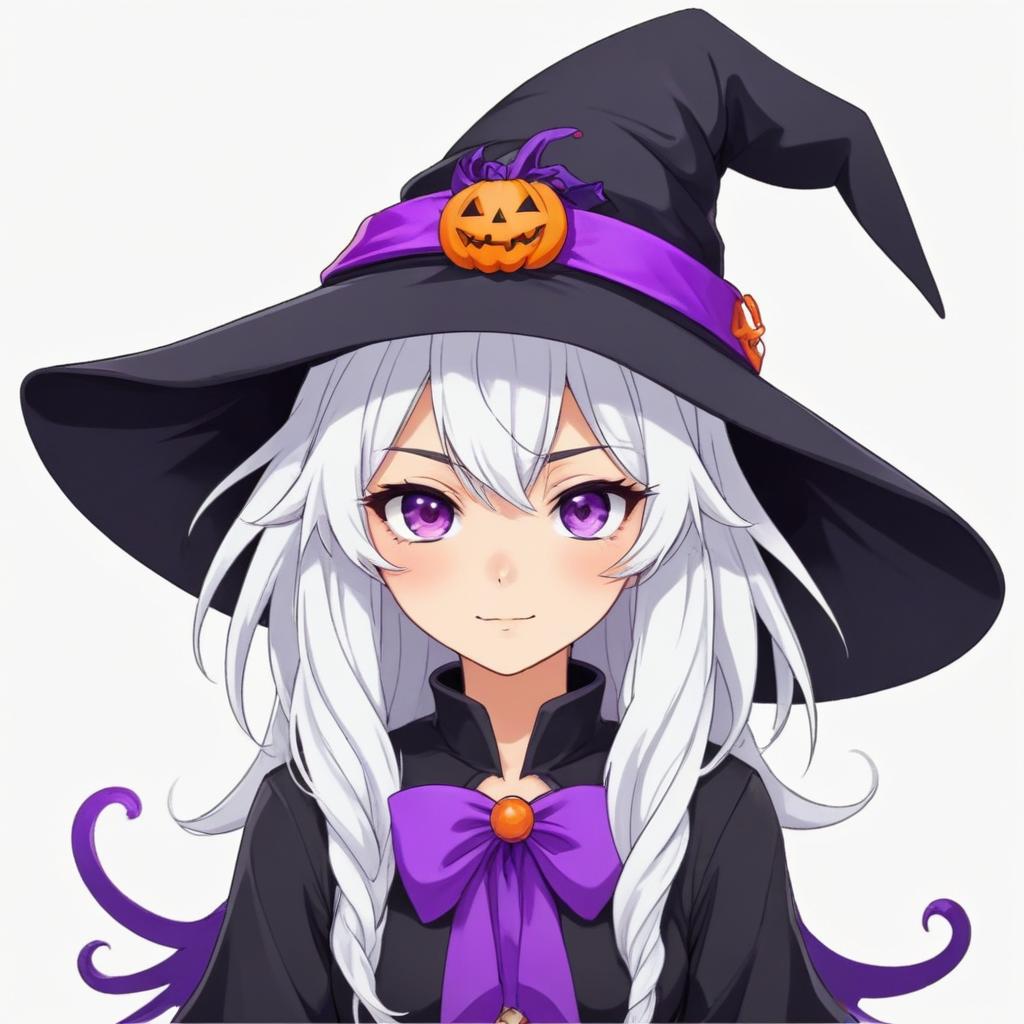 A young witch with white hair and purple eyes wears a black hat and dress. She has a playful expression and festive pumpkin decorations.