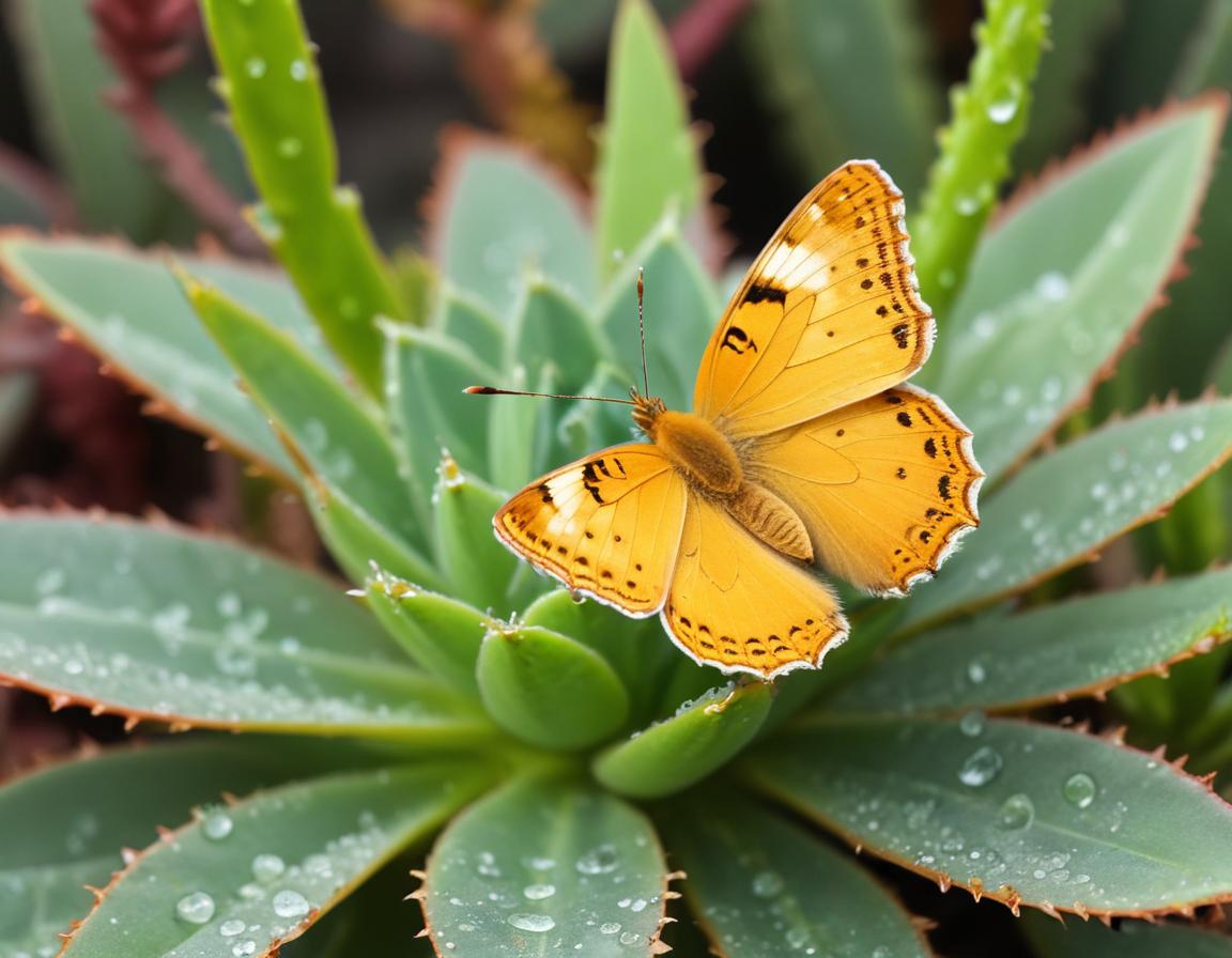 A vibrant orange butterfly is perched on green succulent leaves, with droplets of water adding a fresh touch to the scene.