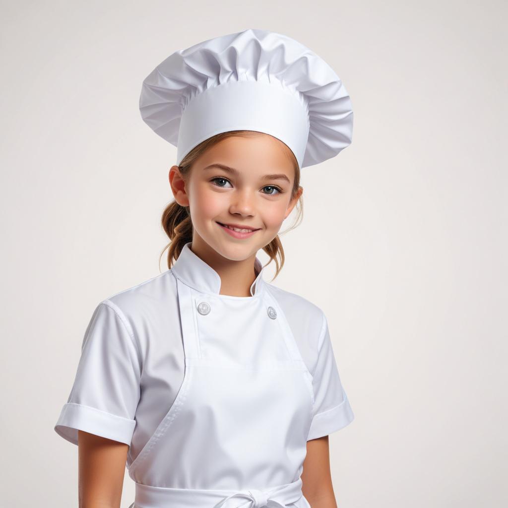 A young girl, dressed in a white chef uniform and hat, smiles confidently. She is ready to cook and showcase her culinary skills.