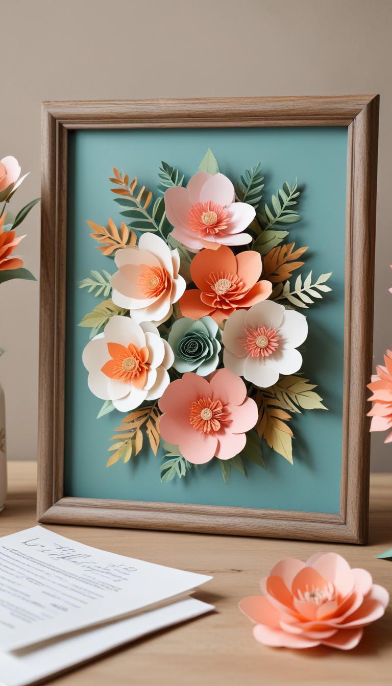This decorative piece features vibrant paper flowers in peach and white, arranged beautifully in a wooden frame against a teal background.