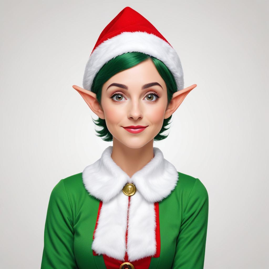A cheerful elf with vibrant green hair and a red and white hat smiles. She wears a green outfit with white cuffs, radiating holiday spirit.