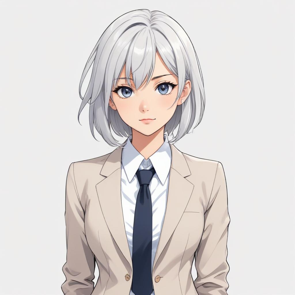 anime character, blazer, business attire, business outfit, clean design, confident, elegant, expression, fashion, female character, modern style, portrait, professional attire, serious look, short hair, silver hair, simple background, studio background, tie, young woman