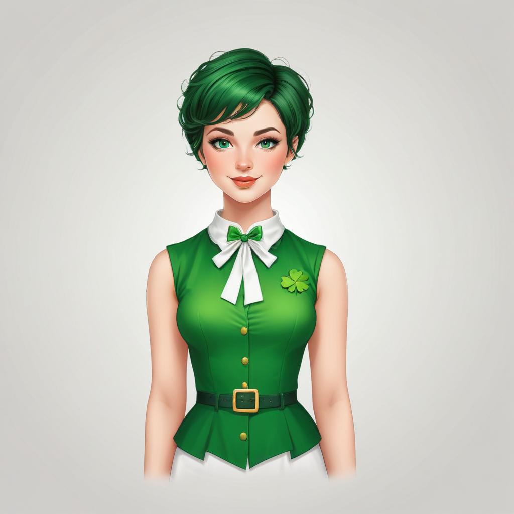 celebration, character illustration, cheerful expression, cultural celebration, cute design, fashion design, festive attire, festive clothing, friendly demeanor, green outfit, hair fashion, holiday spirit, joyful mood, portrait art, seasonal event, shamrock, smiling face, spring event, stylish look, young woman
