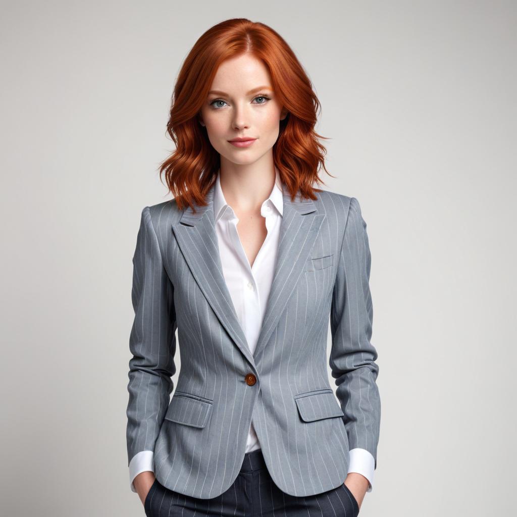 attire, authority, blouse, business, confident, demeanor, elegance, fashion, formal, gray, office, portrait, posing, professional, red hair, smart, striped, style, suit, woman