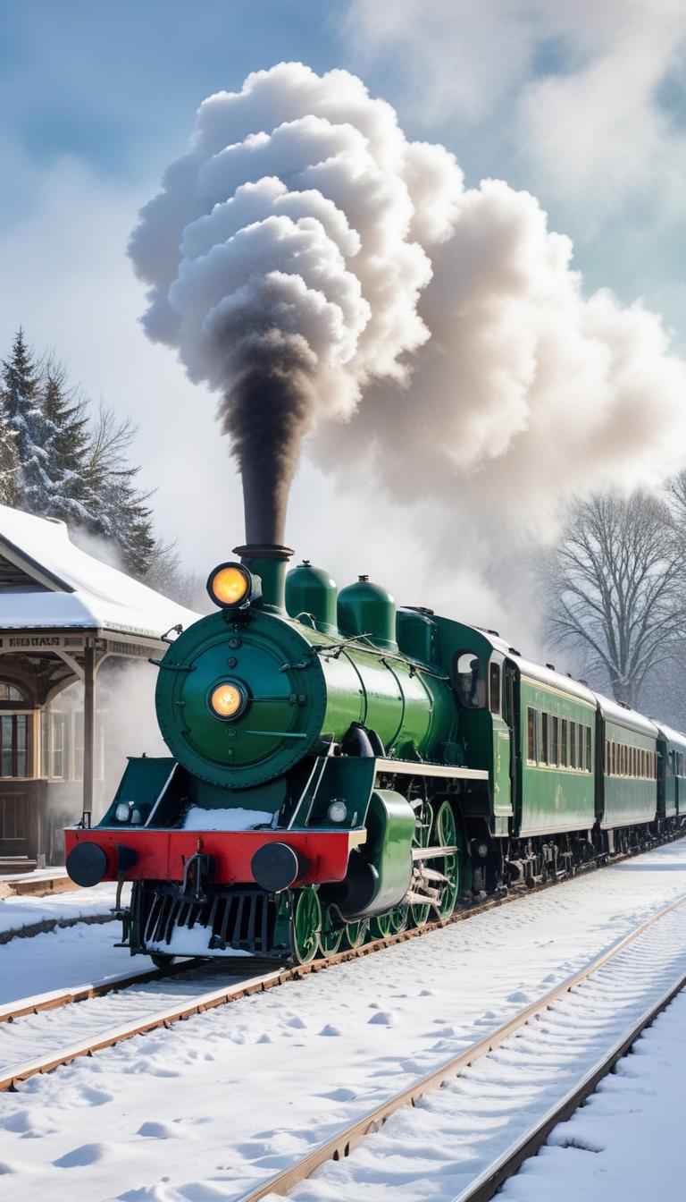 adventure, countryside, forests, green train, historic train, locomotive, nature, railway, retro, scenic, smoke, snowy landscape, snowy tracks, steam engine, steam train, train station, transportation, travel, vintage, winter