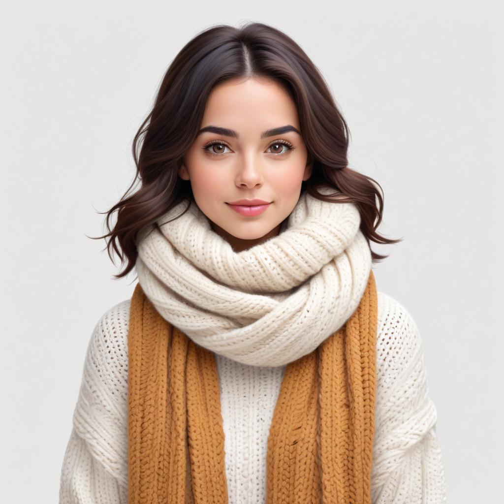 A young woman smiles while wearing a chunky white sweater and a large beige scarf. She stands against a light background in a winter setting.