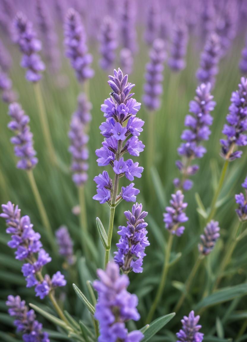 Vibrant purple lavender flowers bloom gracefully in a peaceful field under soft sunlight, showcasing nature's beauty during the summer.