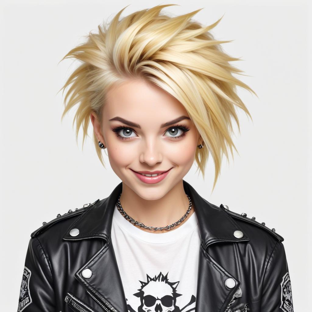 accessories, blonde, casual wear, chic, confident, creativity, edgy, expression, fashion, hairstyle, individuality, leather jacket, modern style, portrait, punk, smiling, spiky, trendy, urban, youth