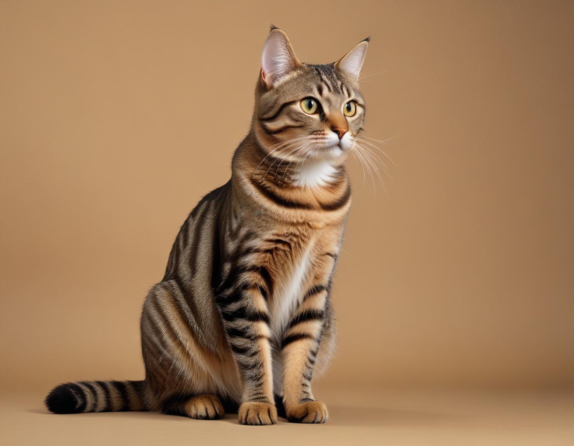 A sleek tabby cat sits upright against a soft beige background, showcasing its striking stripes and attentive expression.