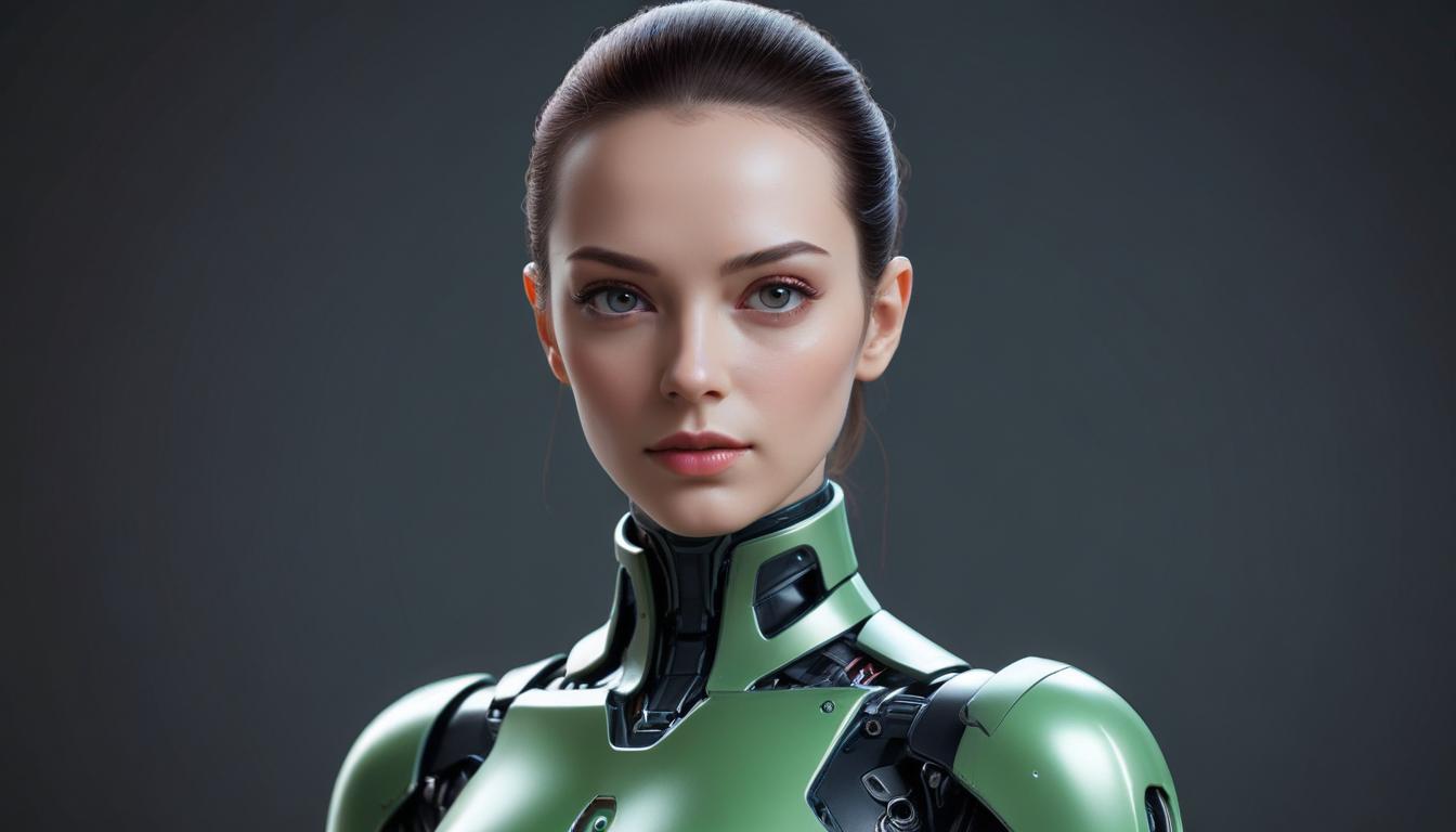 aesthetics, appearance, artificial intelligence, character, cybernetic, design, elegance, fashion, features, futuristic, green, humanoid, innovation, machinery, model, portrait, robot, strength, studio, technology