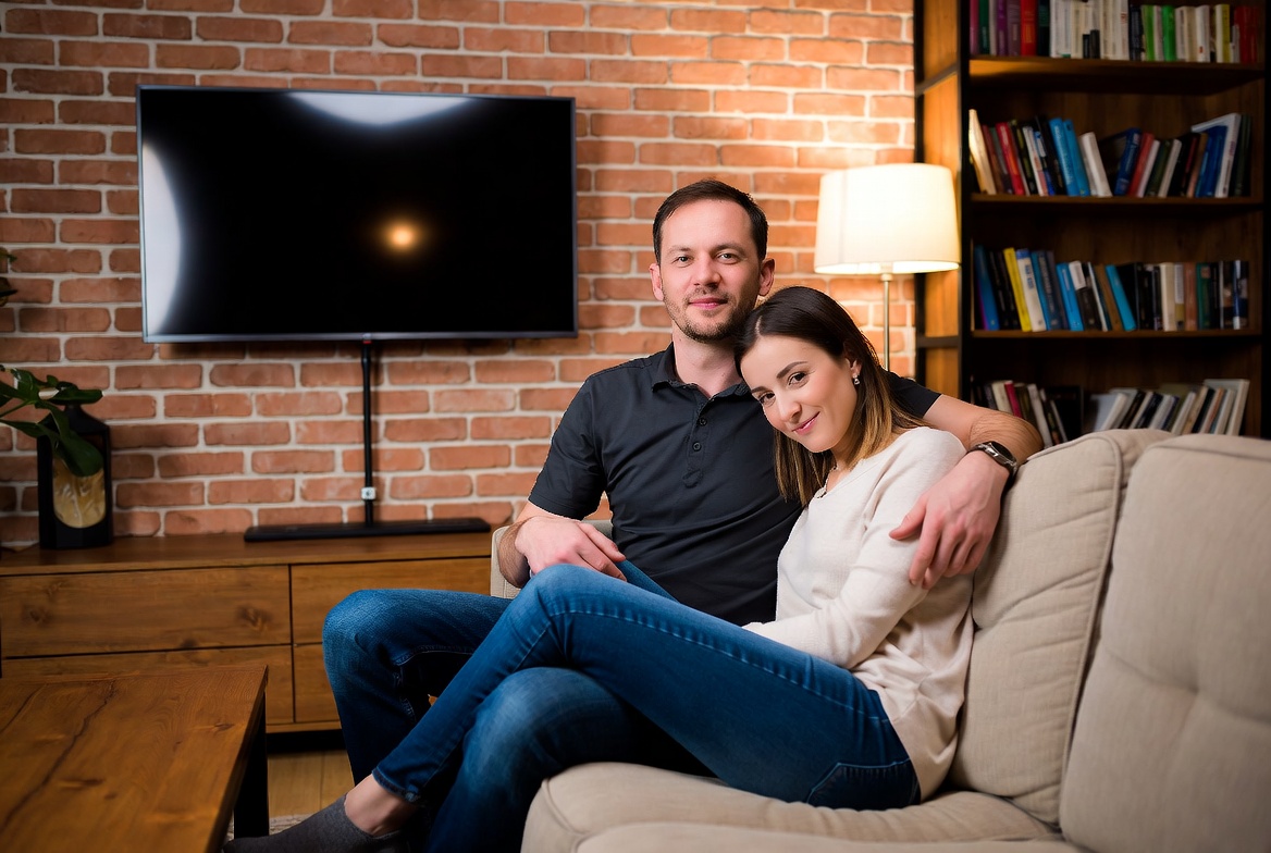 A man and woman relax together on a sofa in a stylish living room, surrounded by warm decor in the evening light.