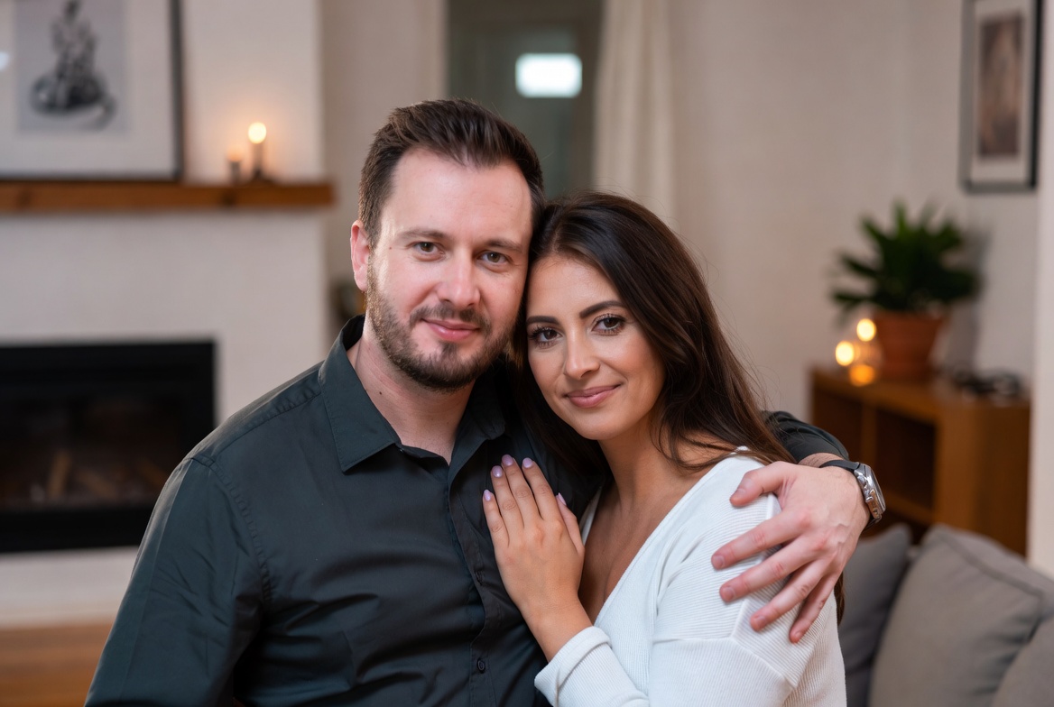 A couple smiles and embraces in a cozy living room, with soft lighting and a warm atmosphere creating a romantic vibe.