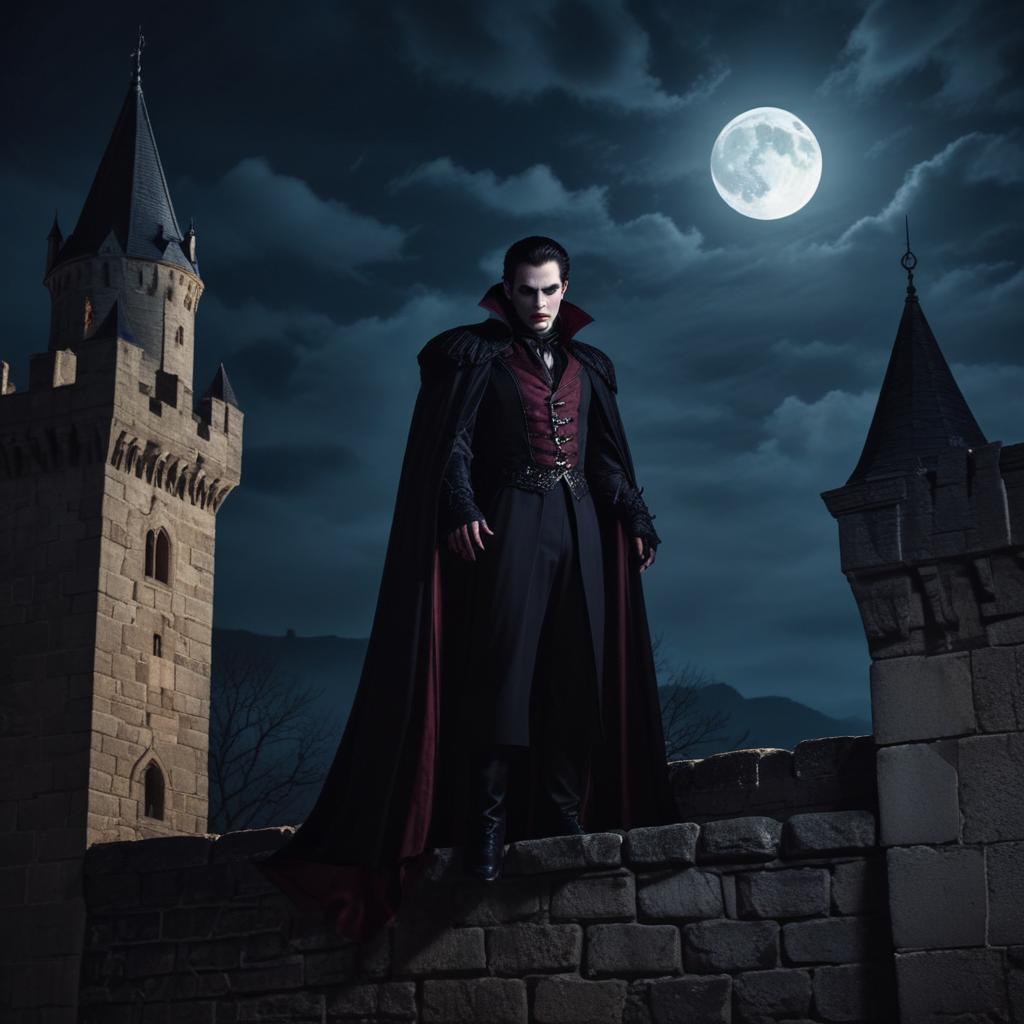 A mysterious figure in dramatic attire poses on a castle wall, with a full moon illuminating the night sky and clouds.