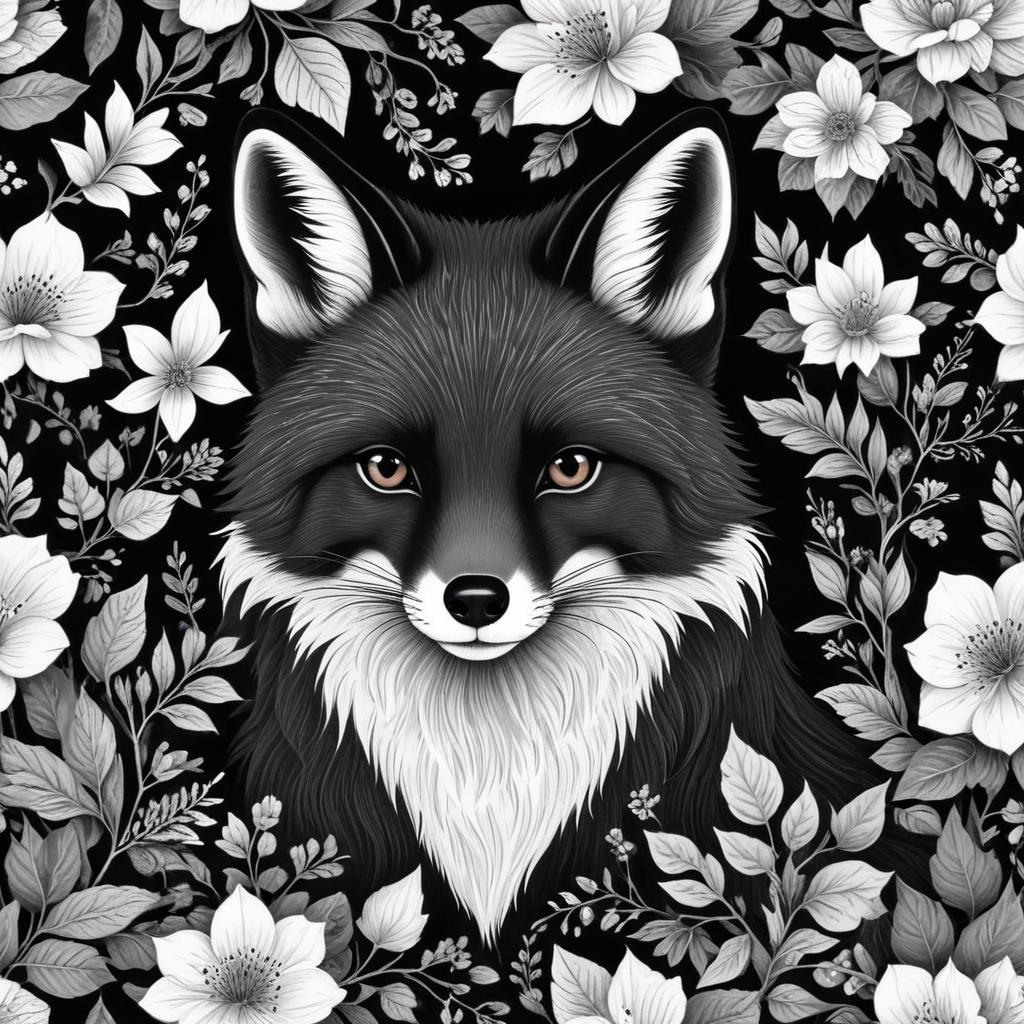 Fox encircled by detailed black and white florals