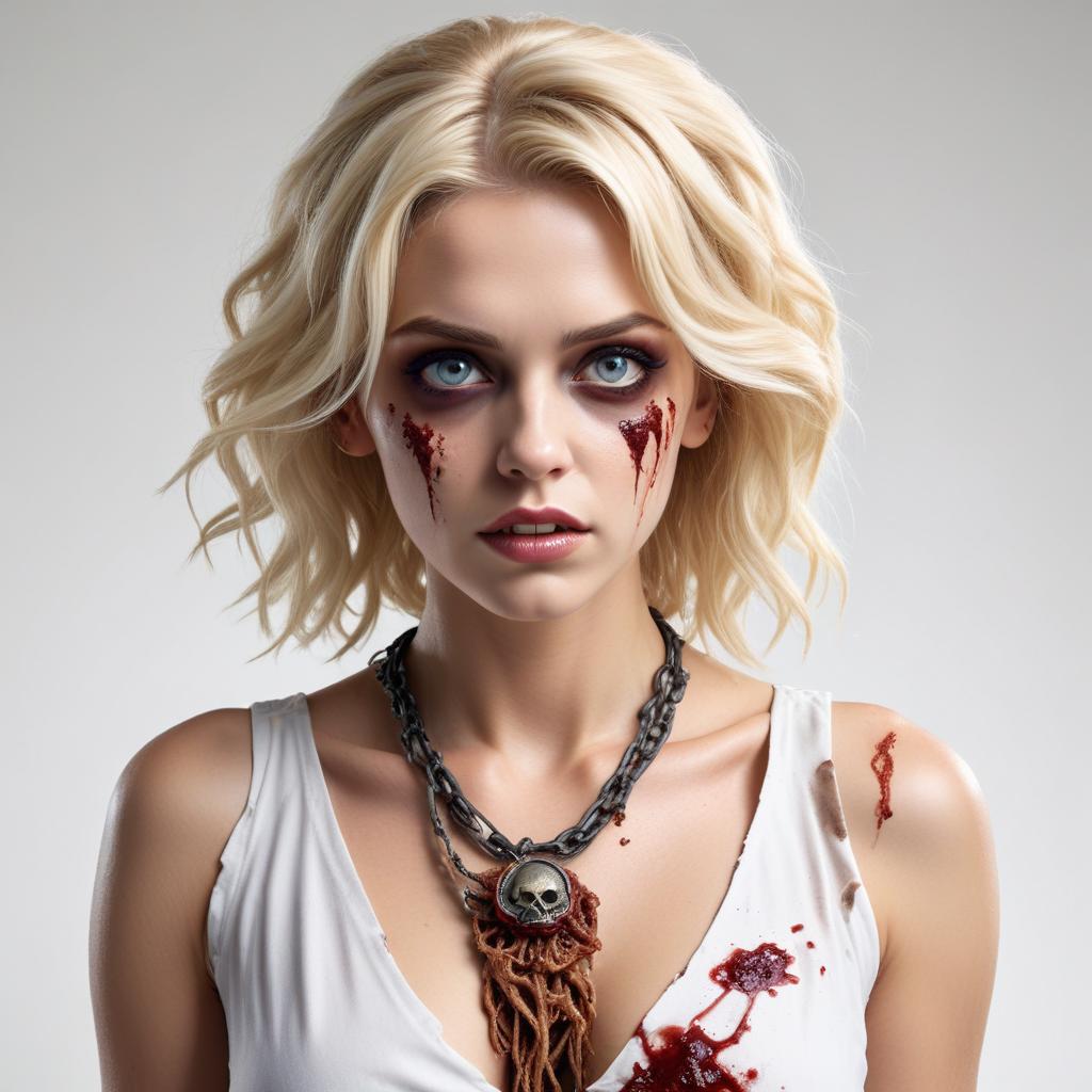 blonde, blood, costume, creative, dramatic, eerie, expression, fantasy, fashion, hair, horror, imagery, makeup, model, necklace, performance, photoshoot, portrait, props, stylist