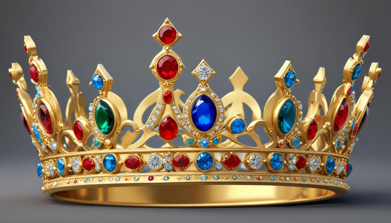 A stunning crown made of gold with red, blue, and green jewels shines brightly against a simple backdrop, showcasing its intricate design.