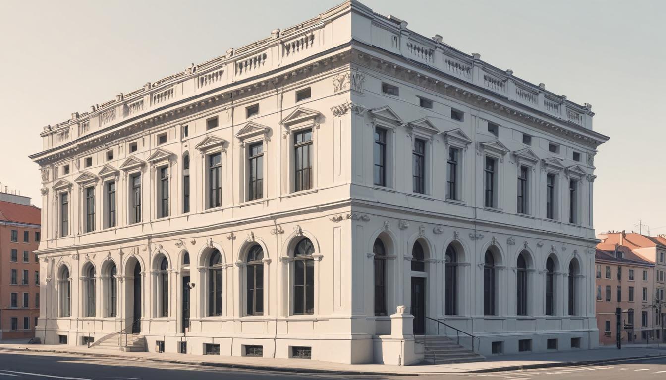 A grand historic building showcases detailed classical architecture in a vibrant city, blending history with modern life.