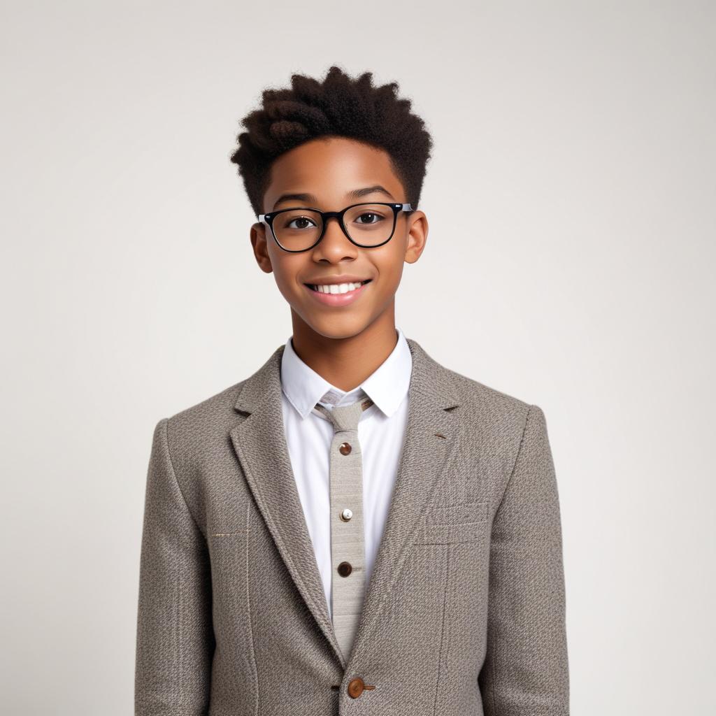 A young boy stands in a stylish suit with glasses, smiling at the camera. The background is plain and light, highlighting his outfit and expression.