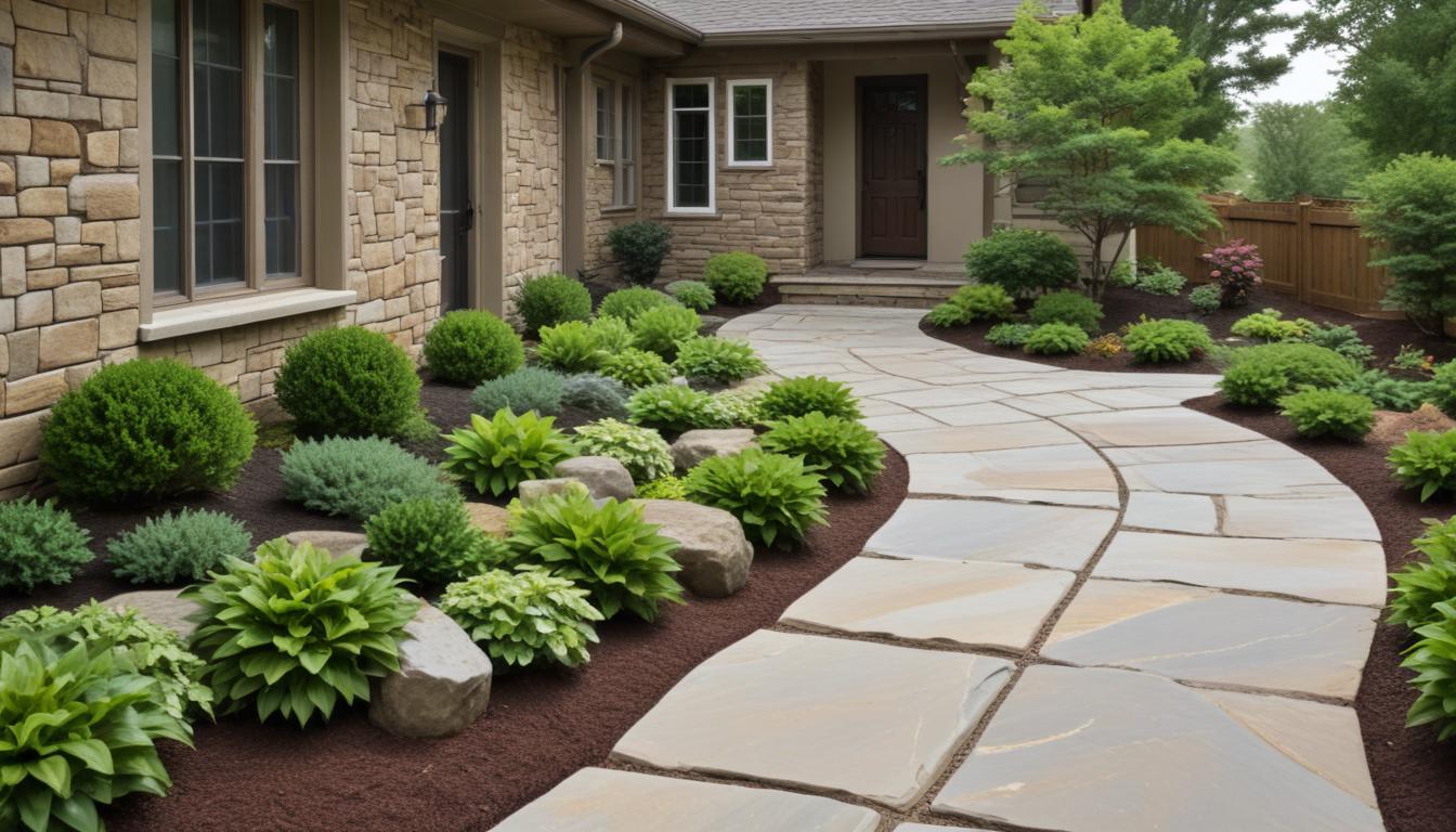 bushes, design, flowers, foliage, garden, greenery, home, landscape, landscaping, lawn, nature, outdoor, pathway, plants, residential, serene, stones, stonework, walkways, yard