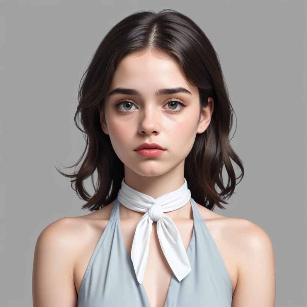 A young woman is posing with a gentle expression, wearing a light blue top and a white scarf around her neck in soft, neutral light.