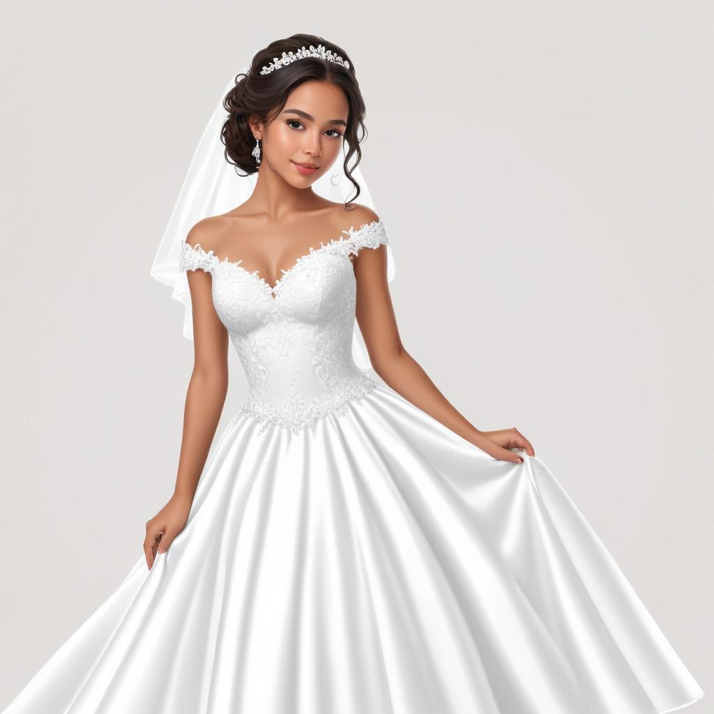 A young woman wears a beautiful white wedding dress featuring off-the-shoulder design and delicate lace. She looks ready for her special day.