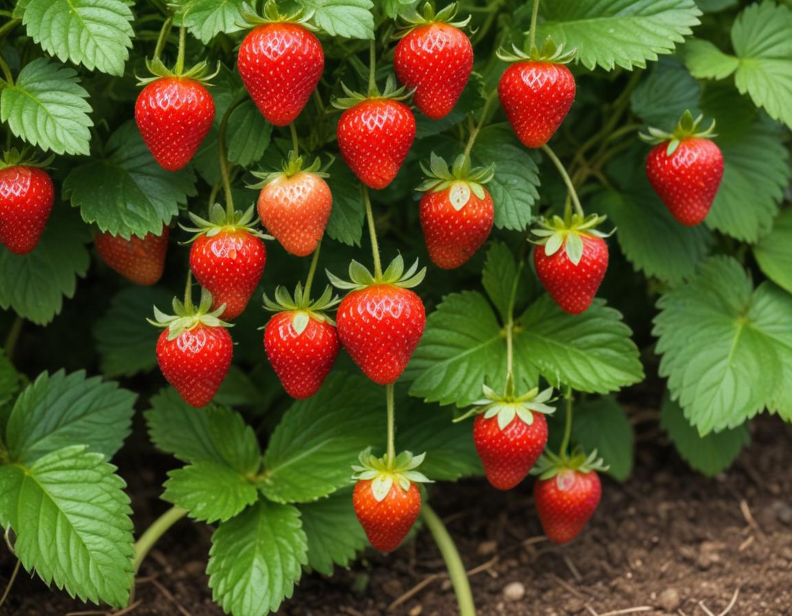 Clusters of bright red strawberries grow abundantly on green leafy plants in a garden during the sunny growing season.