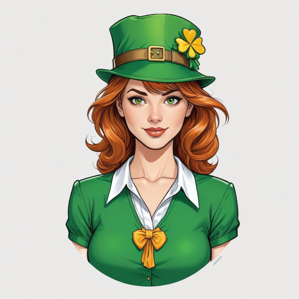 A young woman with red hair wears a green outfit and hat, celebrating St. Patrick's Day with a cheerful expression and festive mood.