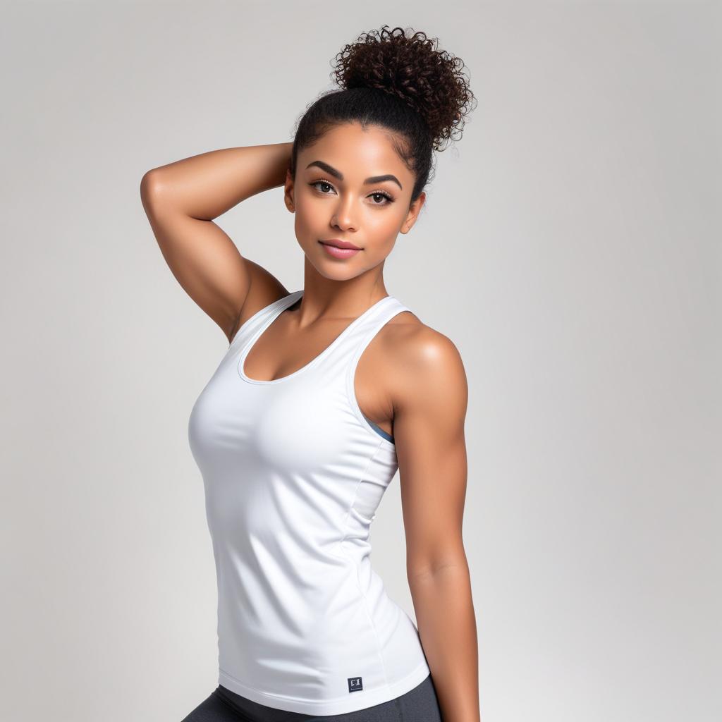 A woman in a white tank top strikes a confident pose, showcasing her fit physique and healthy lifestyle in a neutral backdrop.
