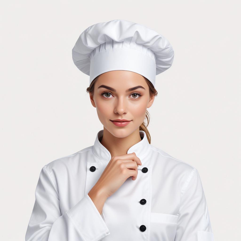 A chef wears a white hat and uniform, looking confidently at the camera with a slight smile, showcasing culinary expertise.