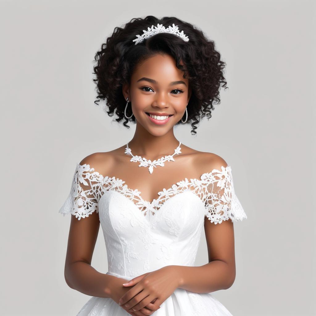 A bride smiles while wearing a stunning white dress with lace details and a delicate tiara. Her curly hair adds charm to the elegant look.