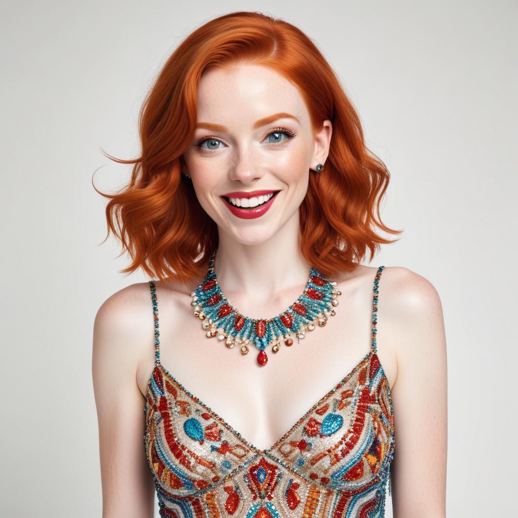 A woman with vibrant red hair is smiling while wearing a colorful, beaded dress with a matching necklace that highlights her beauty.