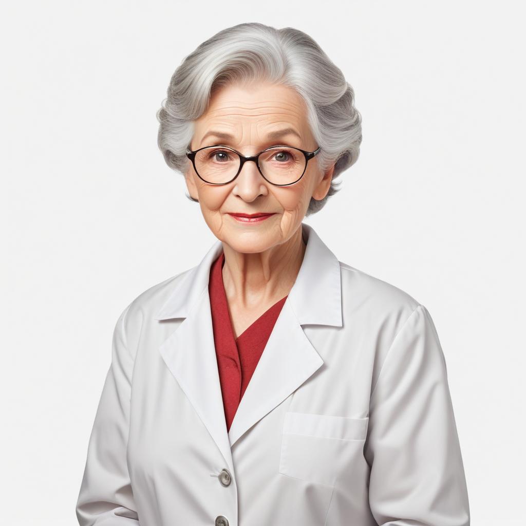 A confident elderly doctor stands in a white coat, exuding warmth and wisdom, ready to assist patients with her expertise.