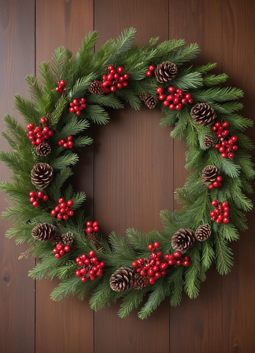 A beautiful wreath made of evergreen branches with pinecones and vibrant red berries hangs on a wooden wall, perfect for holiday decor.