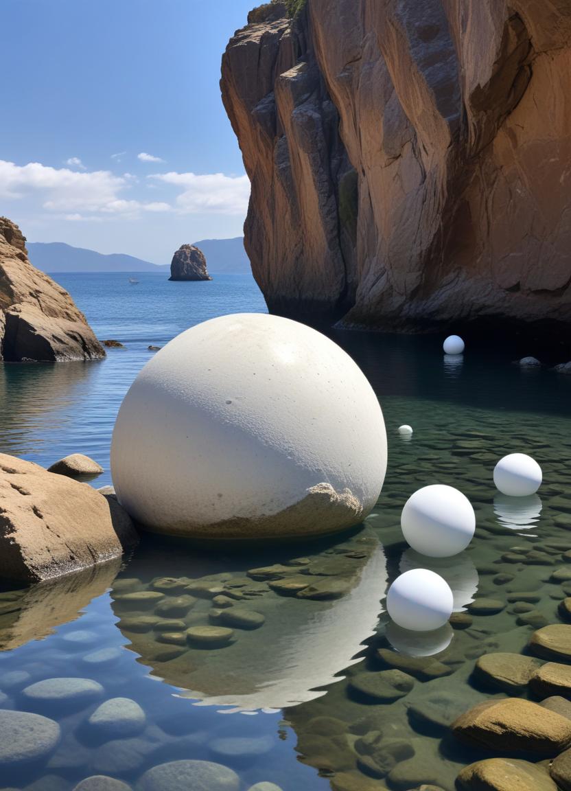 art installation, blue sky, calm, cliffs, coastal, floating, landscape, nature, outdoor, peaceful, reflection, rocks, round shapes, scenery, serene, shoreline, summer, sunlight, water, white orbs