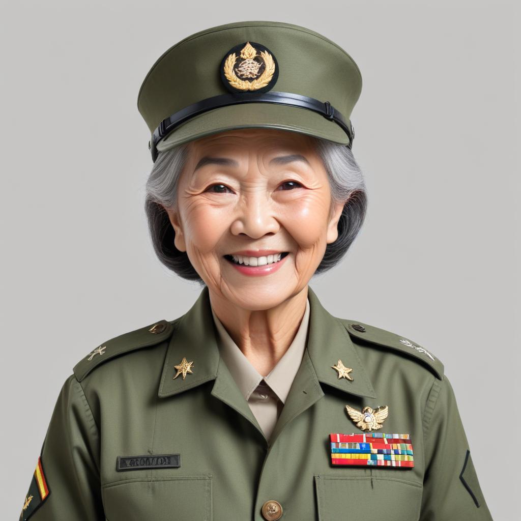 A senior woman in a military uniform stands proudly, smiling. She wears a green cap adorned with insignia and displays several medals.